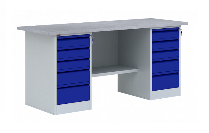 Металлические слесарный верстак ВП-6Т/1,6 представляет собой рабочий стол для ручной обработки металлических, деревянных изделий, а также предметов, выполненных из других материалов. Металлический верстак используется в мастерских, гаражах, автосервисах и в других рабочих зонах. Он являются основой, как небольшого промышленного производства, так и крупного предприятия. Допустимая равномерно распределенная нагрузка на верстак - 1000 кг, на полку верстачную - 40 кг, на выдвижной ящик - 30 кг. В комплект верстака ВП-6Т/1,6, входит: столешница СТ-3 из МДФ, покрытая оцинкованным листовым металлом, стенка задняя металлическая, две тумбы Т-2 с пятью выдвижными ящиками на телескопических направляющих. Тумбы закрываются центральным ключевым замком. Дополнительно на верстак можно установить перфорированный экран соответствующего размера, аксессуары на экран. Цвет: верстак - серый Ral 7035, дверь тумбы - синий Ral 5002