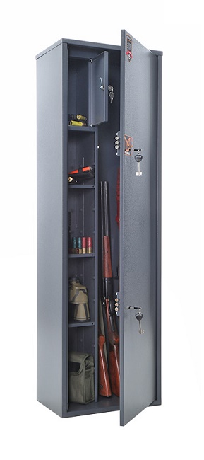 Шкаф оружейный Чирок 1443 предназначен для хранения огнестрельного оружия и соответствует требованиям ст.59 Постановления правительства РФ № 814 от 21 июля 1998 года О мерах по регулированию гражданского и служебного оружия и патронов к нему на территории РФ. Изготовлен из металла толщиной 1,5 мм. Внутренние размеры шкафа (ВхШхГ)мм 1375x426x255, размер патронного отделения (ВхШхГ) мм 300х178х181. Максимальная высота ствола 1370 мм. Вместимость шкафа 3 ствол. Шкаф комплектуется полкой и 2 ключевыми замками. Предусмотрена возможность анкерного крепления к стене. Цвет шкафа -графит структурированный. Тип покрытия порошковое